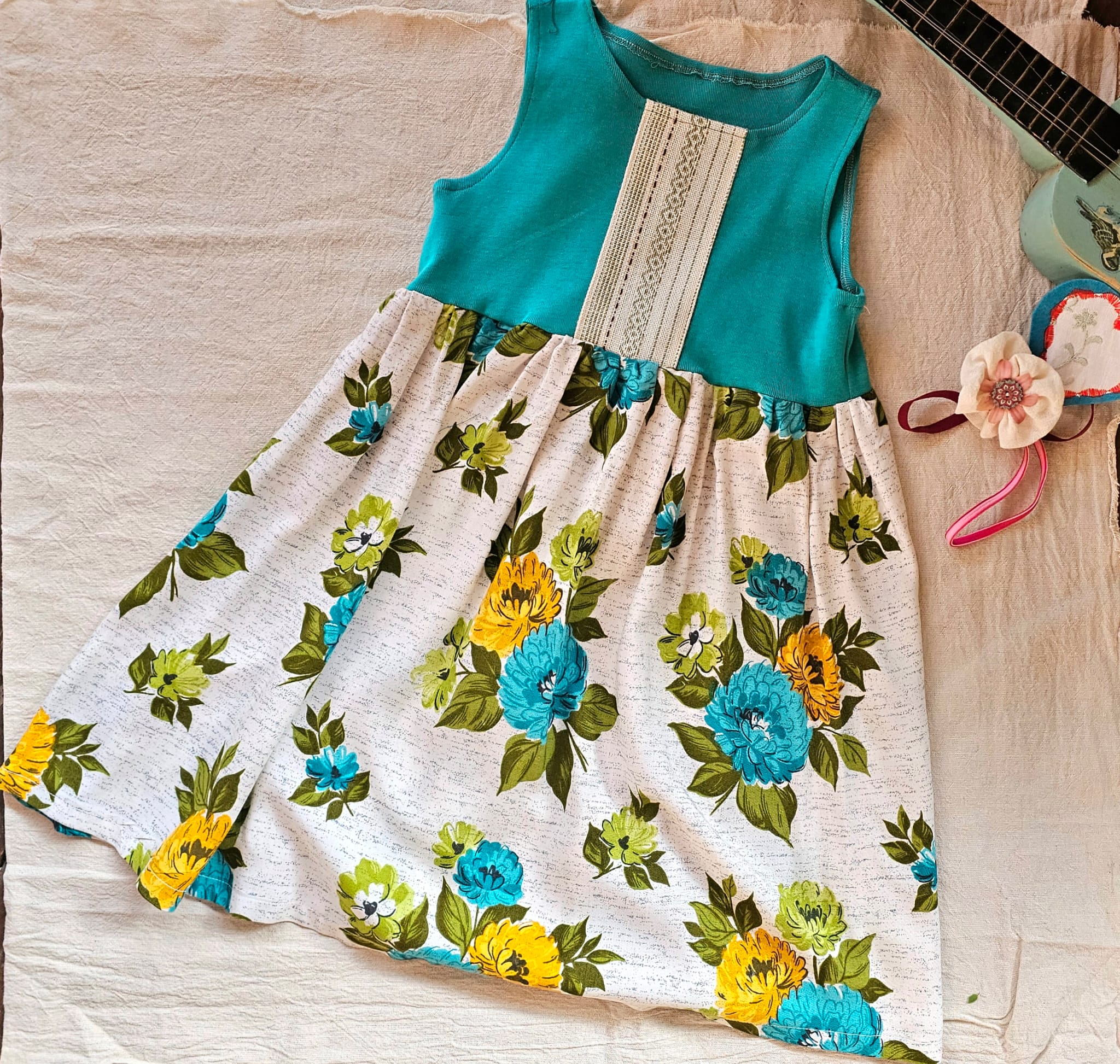 Rochie din jerse de bumbac cu elastan cu broderie recuperata si tricot de bumbac imprimat, este alegerea perfectă pentru zilele însorite și momentele de joacă! Cn