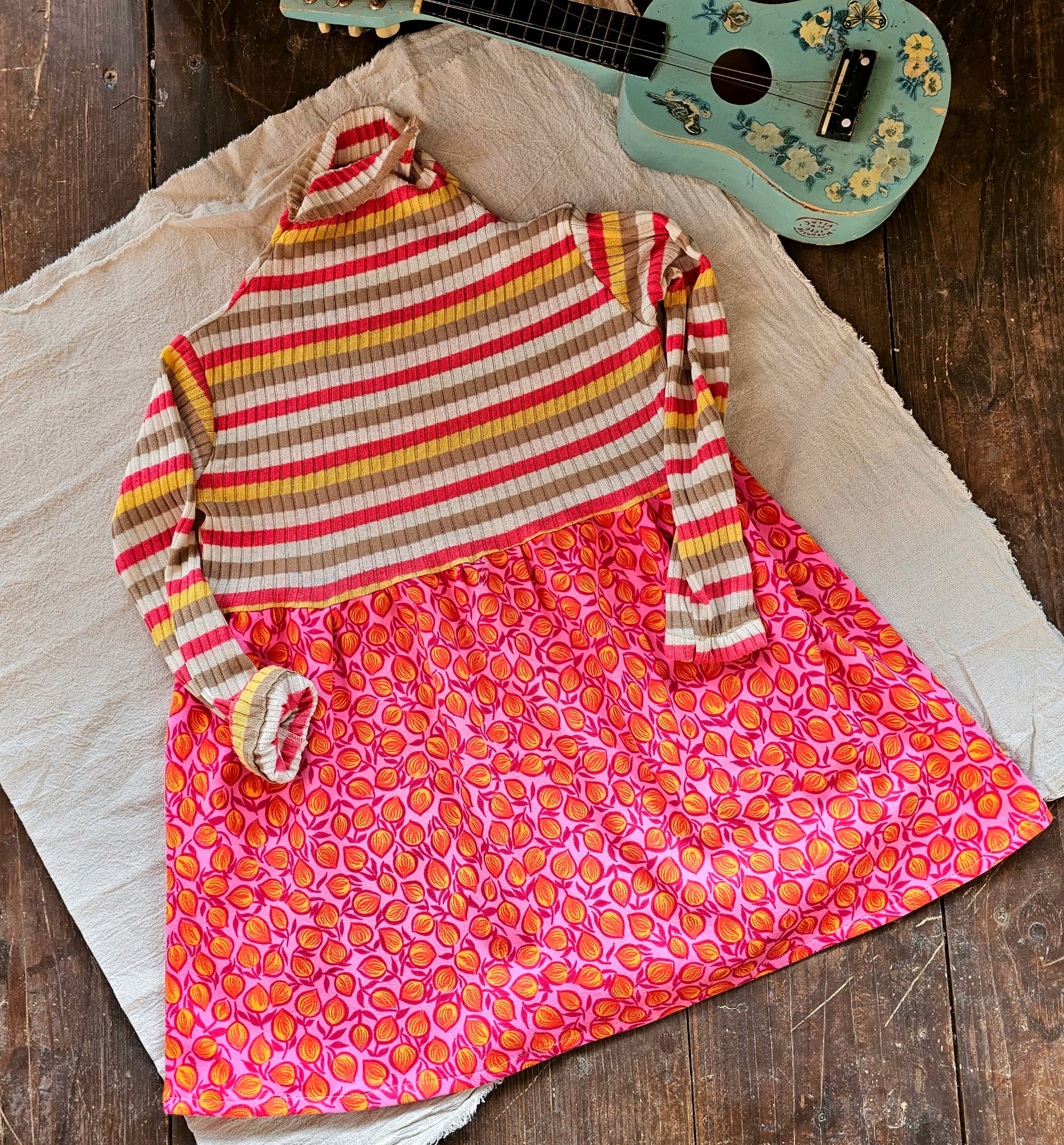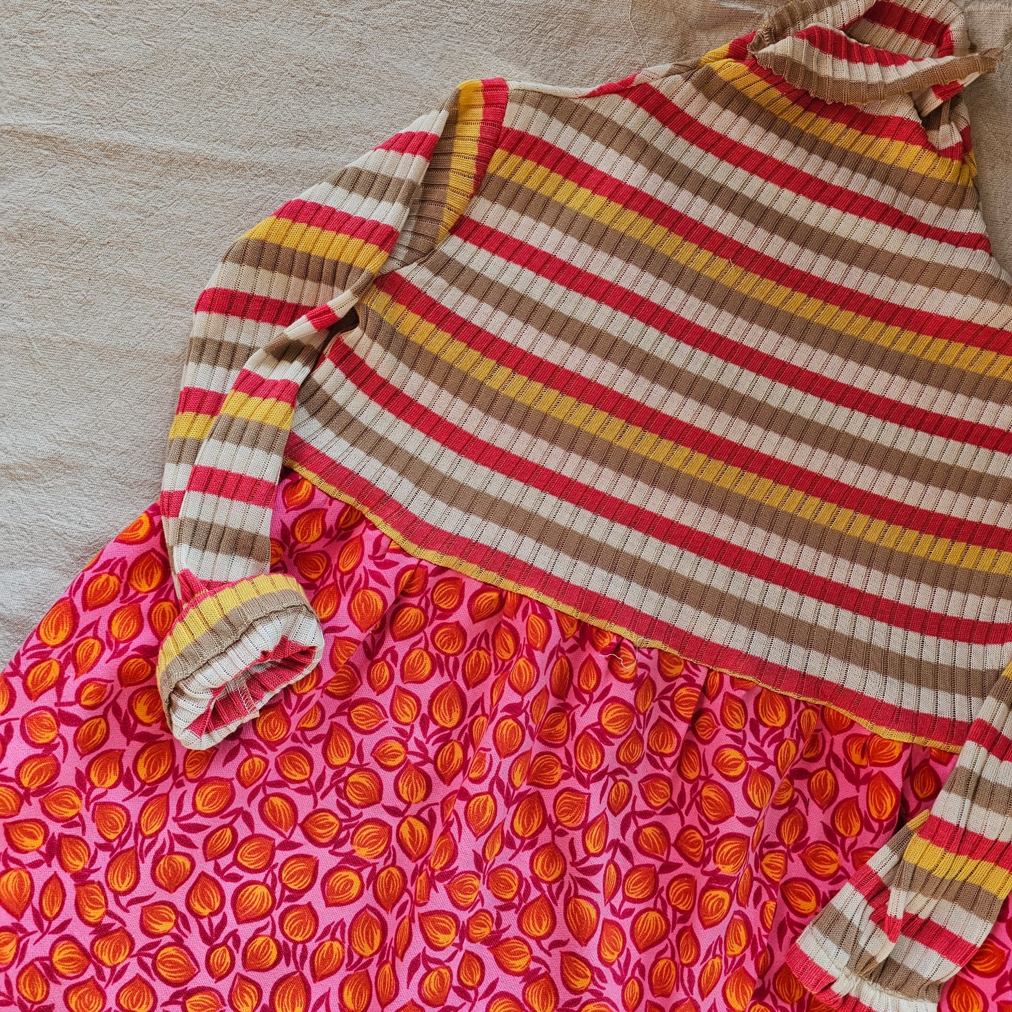 Această rochie îmbină armonios topul din tricot de bumbac cu elastan, cu dungi și guler înalt, și fusta amplă din poplin de bumbac imprimat, creând un design plin de energie și personalitate. Partea superioară este moale, ușor elastică și asigură libertate de mișcare, în timp ce fusta colorată adaugă un plus de veselie și stil.