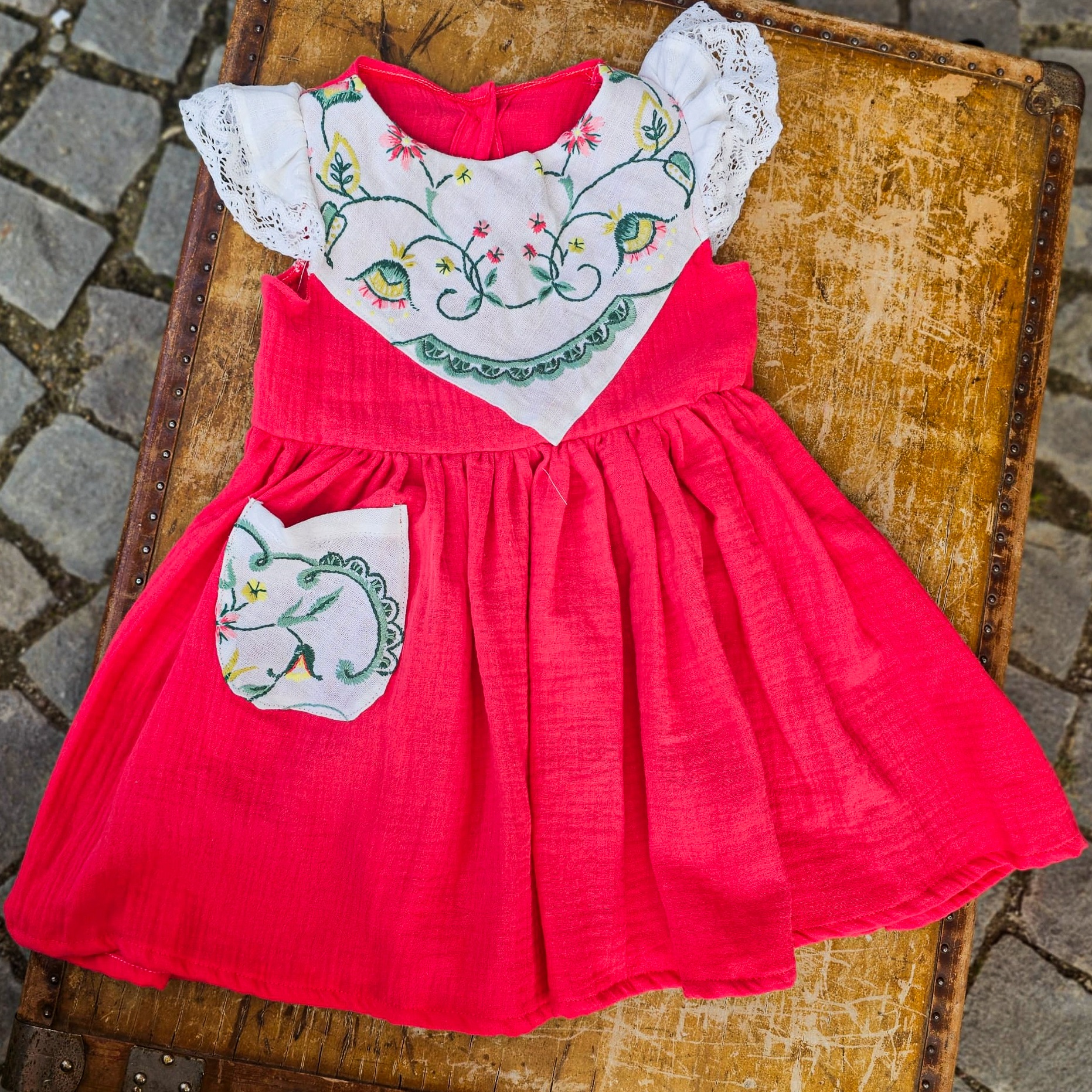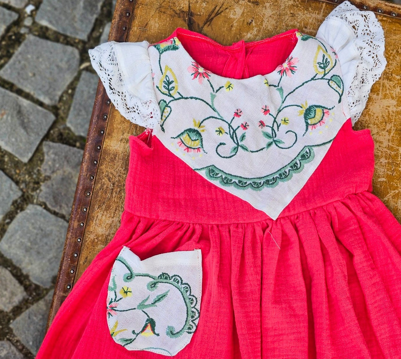 Rochie din muselină dublă de bumbac și broderie recuperată diferită diferită cu volane din dantelă de bumbac.